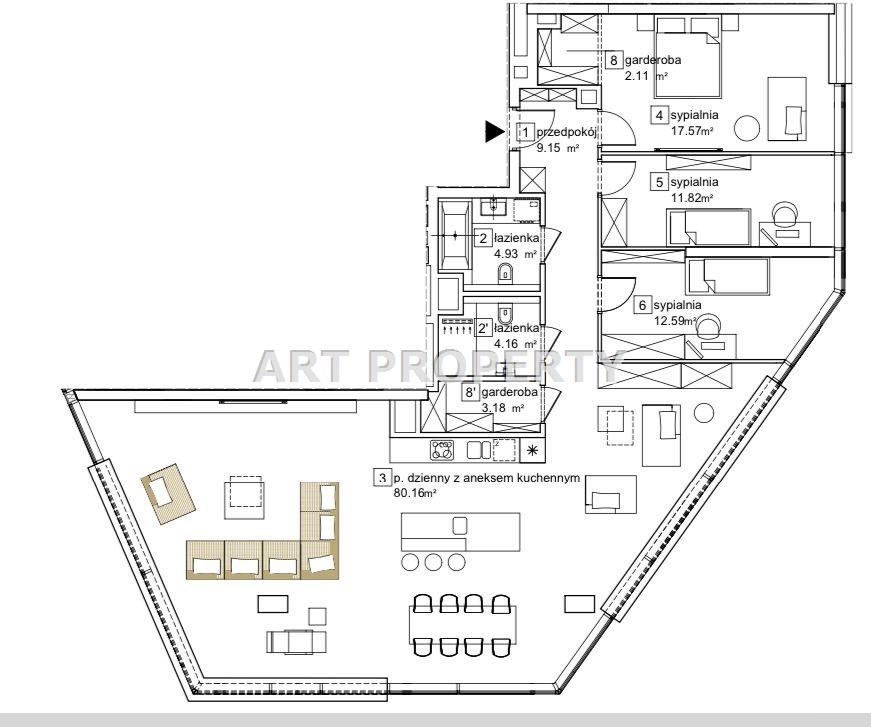 Apartament o powierzchni 146,57 m² to przestronna i funkcjonalna przestrzeń, w skład której wchodzą: