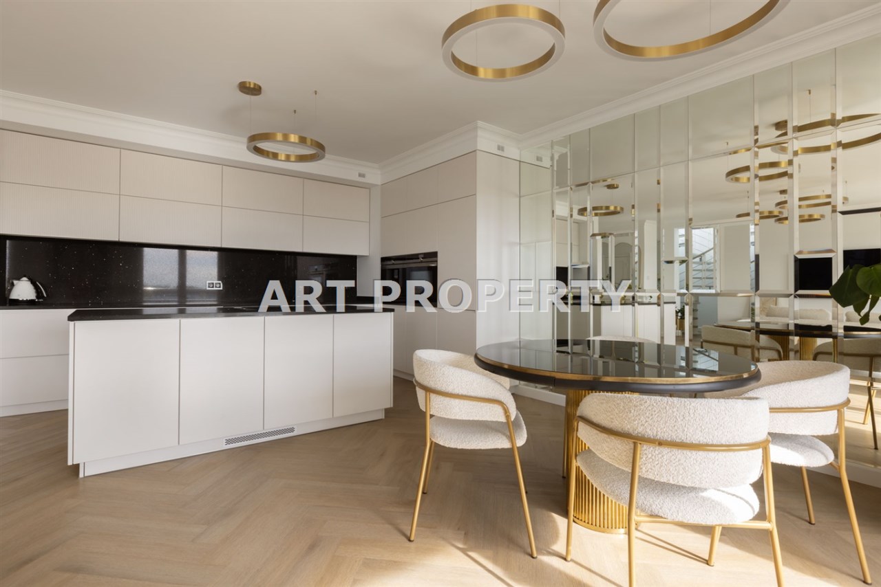 - przestronny i bardzo elegancki salon, podzielony na 3 strefy: wypoczynkową, jadalną oraz kuchenną; komfortowy komplet wypoczynkowy, telewizor, zabudowa Rtv; zabudowa kuchenna na wymiar; sprzęty: lodowka, zmywarka, płyta indukcyjna, zmywarka, piekarnik, ekspress kawowy; stół z krzesłami; wyjście na pierwszy taras, z którego mamy widok na miasto oraz Wisłe- ekspozycja zachodnia