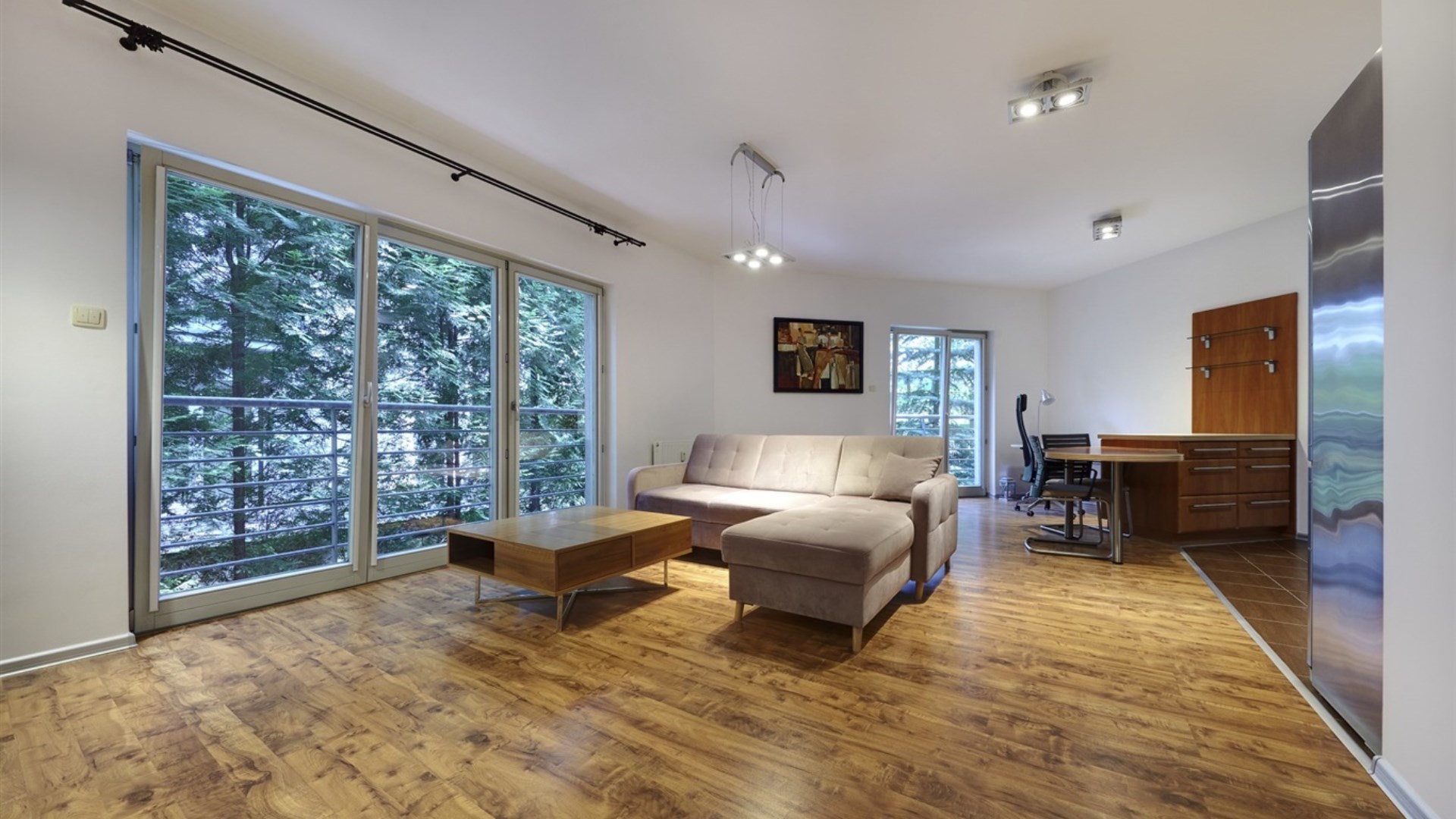Mieszkanie znajduje się na wysokim parterze. Składa się z przedpokoju z miejscem na szafę, przestronnego salonu z wyposażonym aneksem kuchennym, oddzielnej sypialni, łazienki z wc. Lokal wykańczany o wysokim standardzie m.in. sprzęty marki siemens, bosch, liebherr, villeroy&boch, duravit. Wysokiej jakości meble kuchenne w zabudowie.