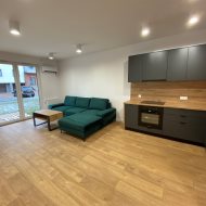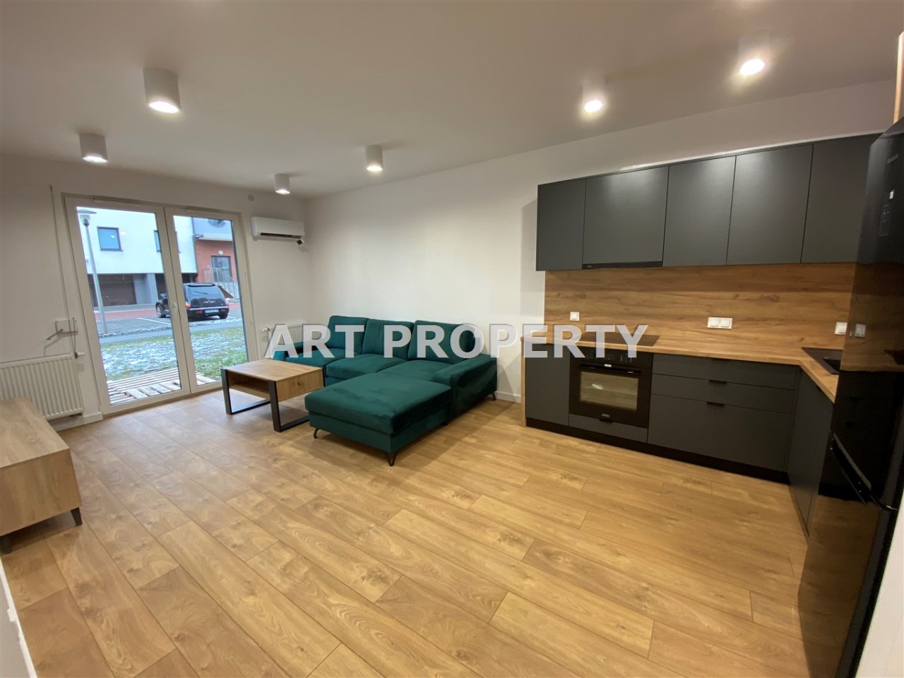 * słoneczny, przestronny i umeblowany salon (ekspozycja południowa) wyposażony w klimatyzacje z wyjściem na ogródek z wybrukowaną częścią tarasową