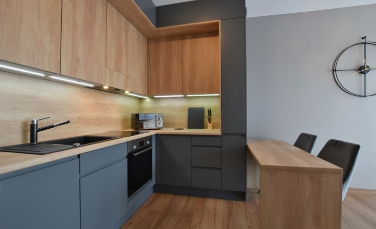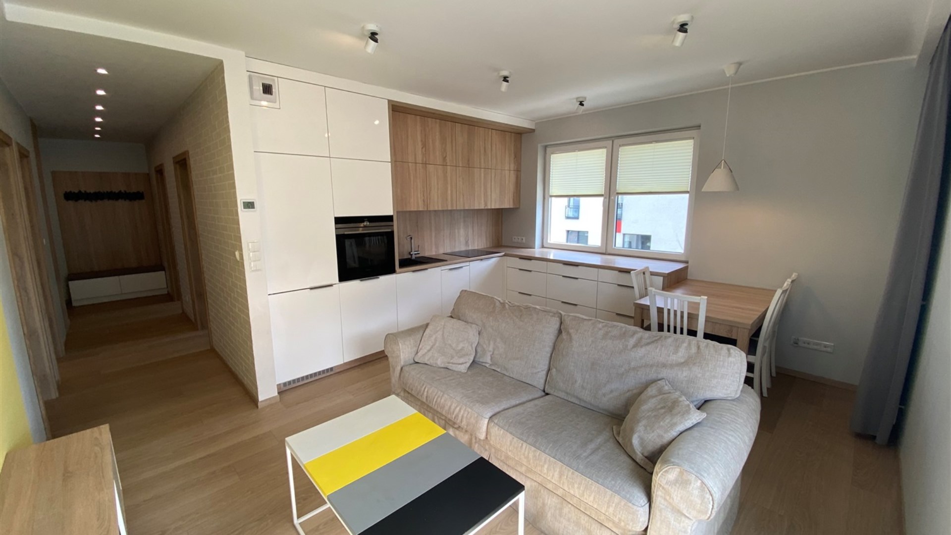 * słoneczny, przestronny salon z aneksem kuchenny (pełni wyposażony w sprzęty agd - zmywarka, lodówka, okap, piekarnik itp.)